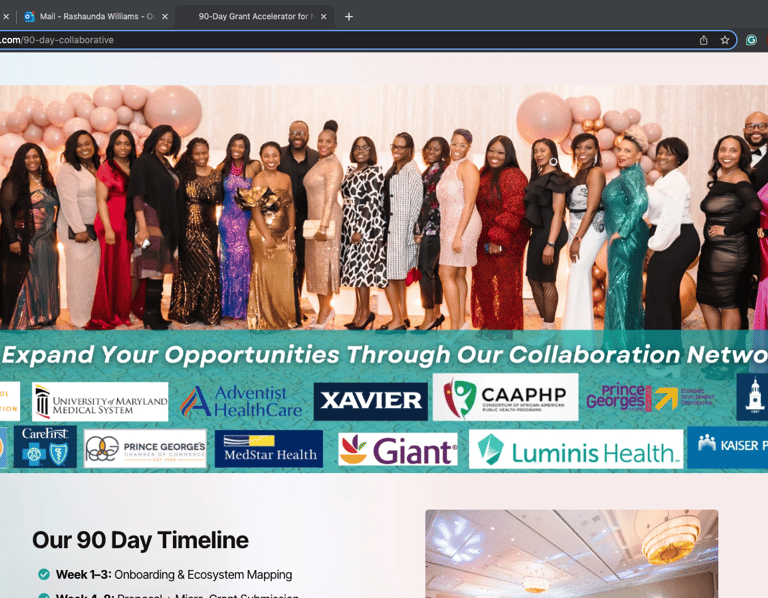 The Community Contracts Collective (CCC) is a 90-day, high-touch accelerator designed to turn your mission into revenue through real-time contract and grant collaboration. You’ll walk away with a fundable proposal, a ready-to-launch income-generating product, and a micro-grant application submitted — all backed by our public health ecosystem and strategic partners.